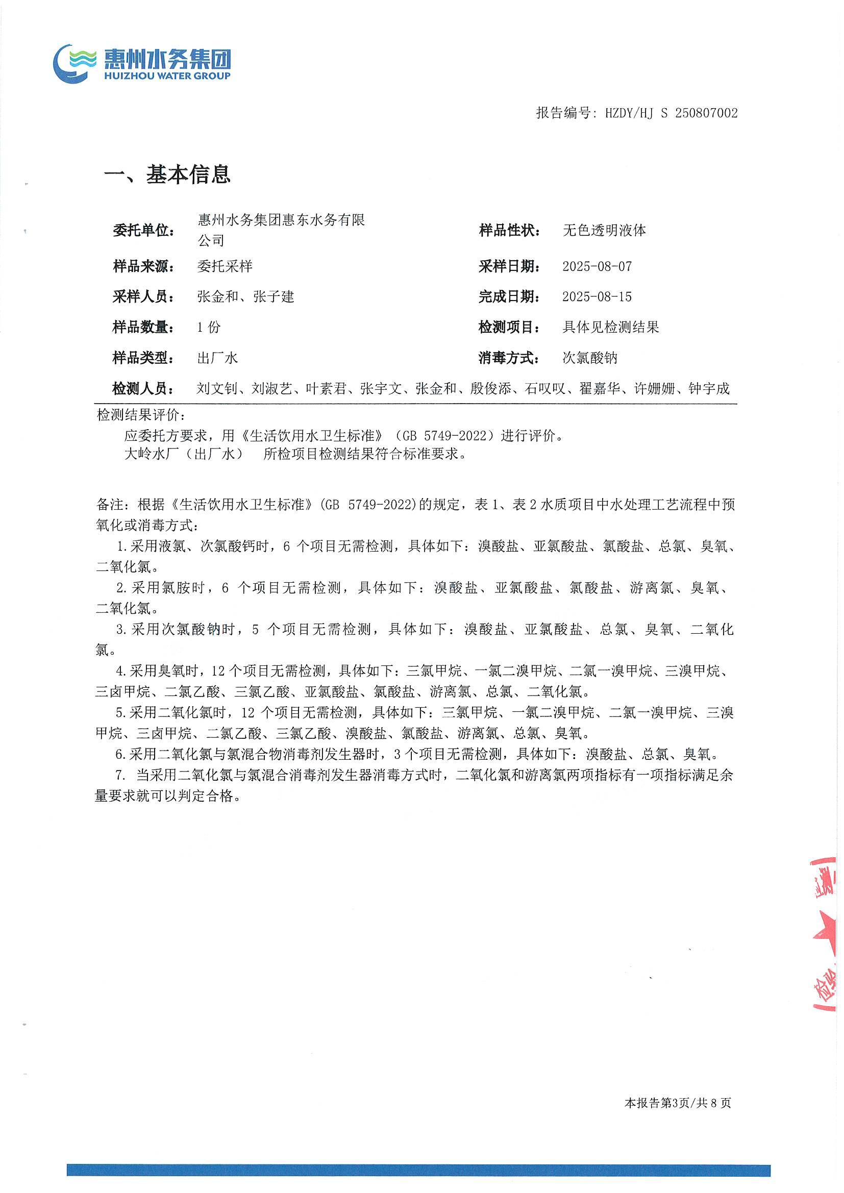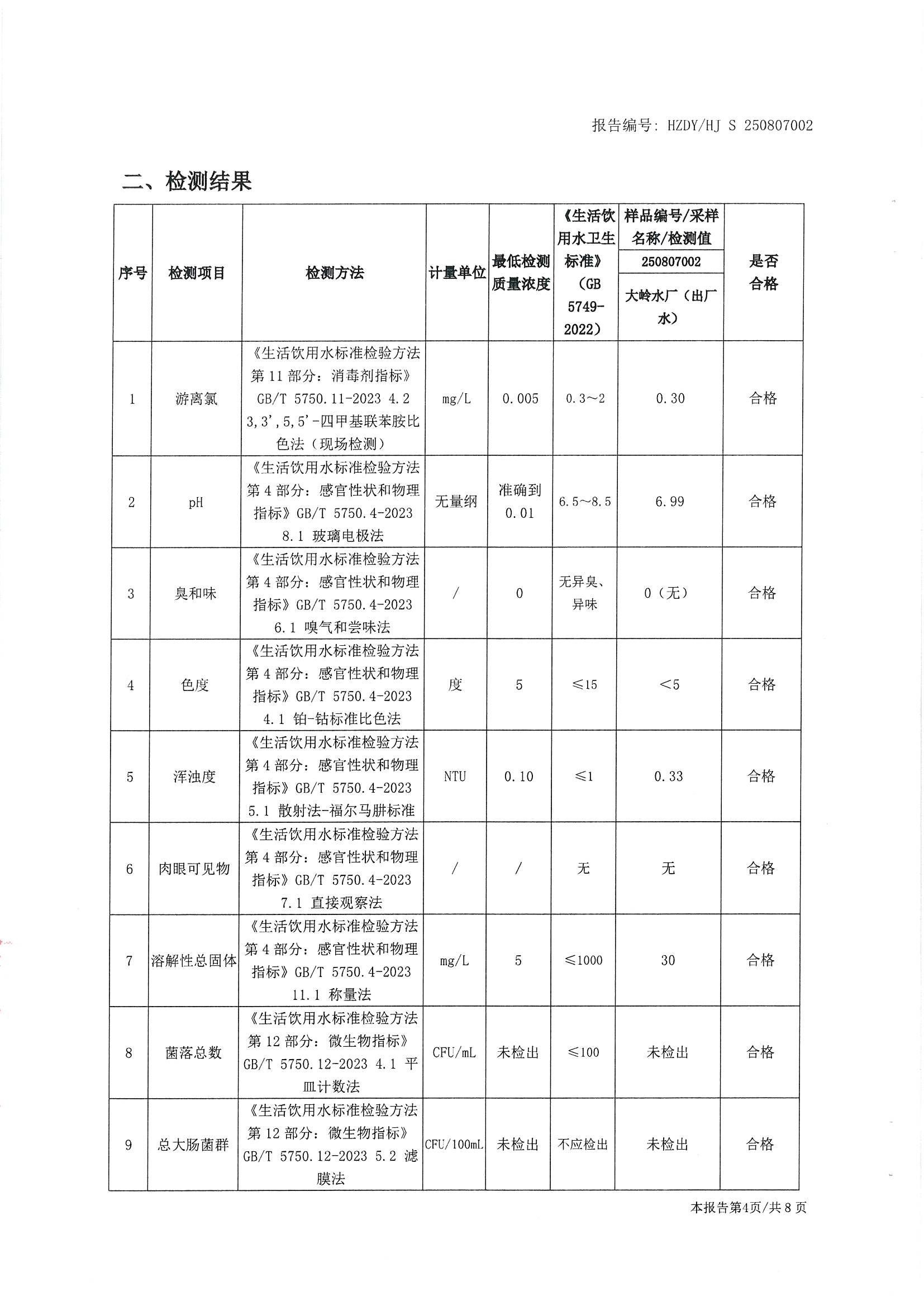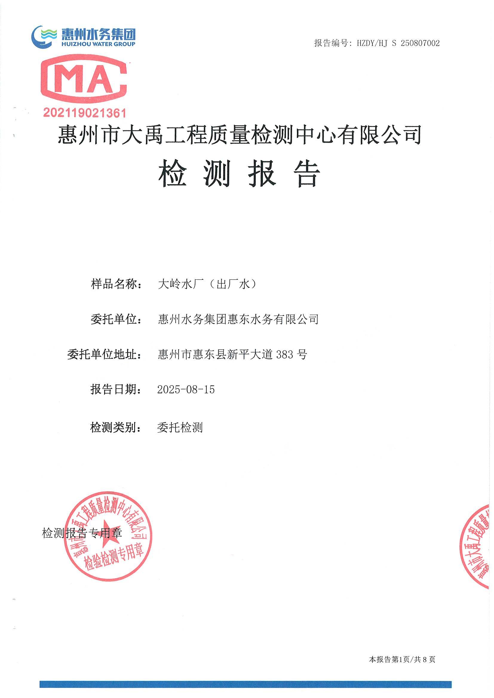 2025年8月份水质检测报告(大岭水厂)
